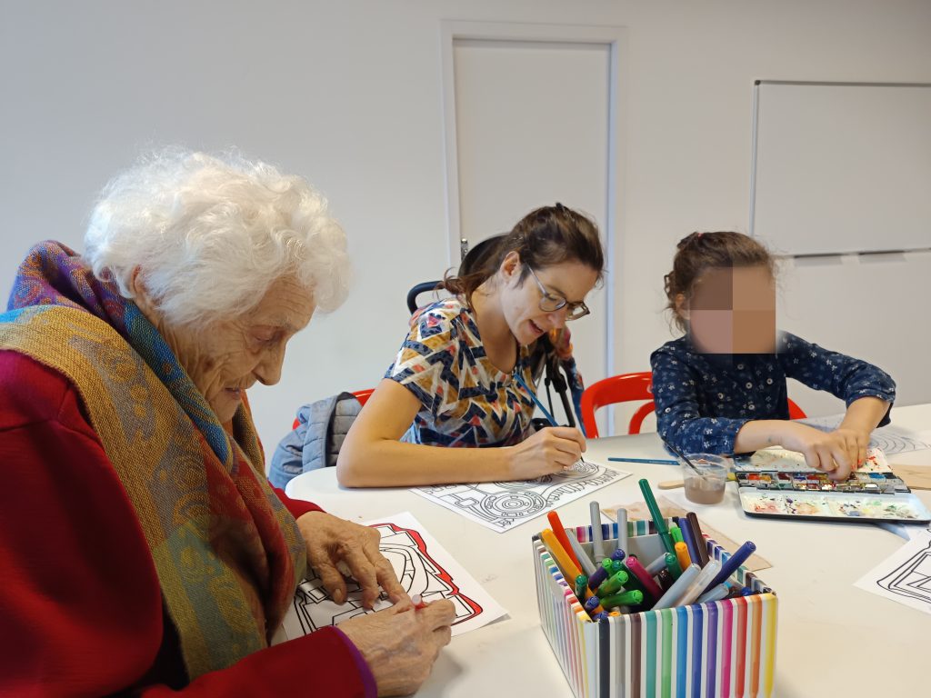 C’est la troisième année que ces rencontres mensuelles ont lieu et c’est toujours avec plaisir que les générations se retrouvent, dessinent, peignent, découpent et surtout échangent.