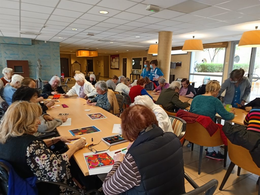 Mercredi 4 février à Notre Dame de la Paix, maison de retraite familiale médicalisée, un grand atelier créatif a eu lieu. Inspirés par l’œuvre de Jim Dine, et plus précisément ses « Cœurs », les résidents ont colorié, peint, découpé et collé sur cette thématique. Cet atelier plein de jolis motifs et de couleurs a réuni les résidents, les résidents du PASA et les personnes accueillies à la journée à L’Odyssée, accueil de jour thérapeutique. Les ateliers créatifs permettent de s’exprimer, de créer, sans le recours des mots; ils favorisent le lien social, stimulent et renforcent l’estime de soi. En ce sens, ils s’inscrivent tout naturellement dans la prise en soins de nos résidents.