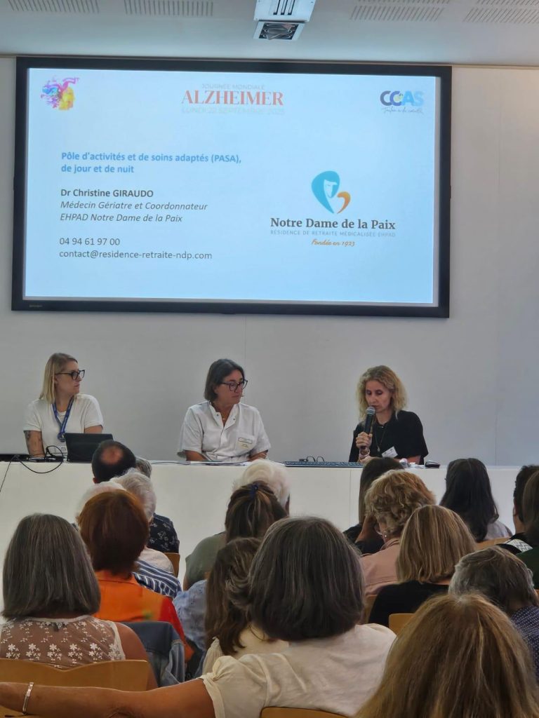 Lundi 22 septembre 2025, Monsieur B. Kurtzemann, Directeur de Notre Dame de la Paix, maison de retraite familiale médicalisée, Madame C. Giraudo, médecin coordonnateur de la résidence et Madame E. Challet, attachée de Direction, ont été conviés à la journée mondiale Alzheimer au CHITS de Sainte Musse.